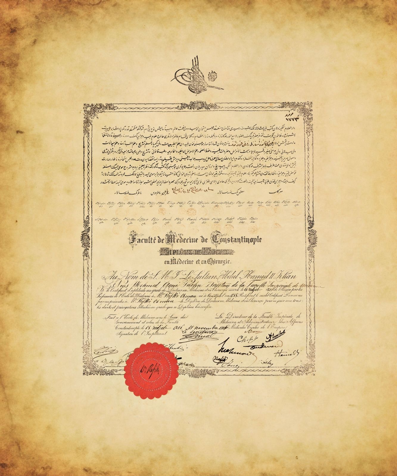 II. Abdülhamit dönemi 2 Aralık 1898 tarihli Rıfkı Osman Efendi'ye ait Tıp İcâzetnâmesi